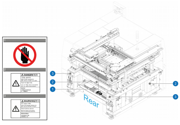 Following labels described in each section are attached on specific position of this machine. Follow the instructions on each label for operating this machine safely. If a label has come off or has damaged, put a new one on a specific position referring to the following figures. For ordering a new label or offering any comment, questions, please contact to the business department or the local agent designated by Hanwha Techwin Co., Ltd.