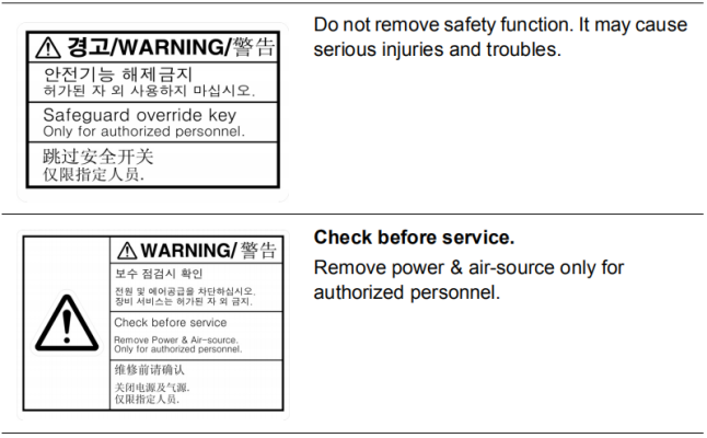 Figure1.1 Safety labels attached on the front part of the machine